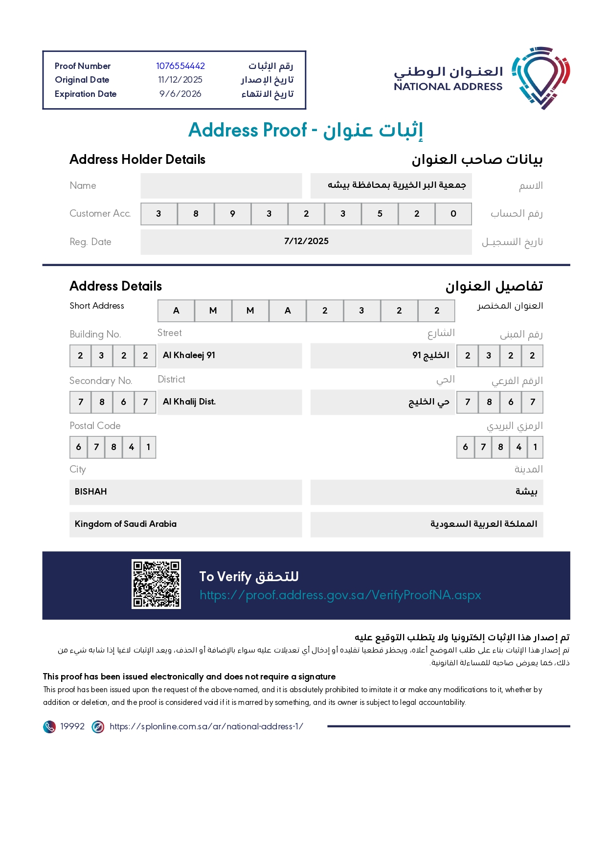 الرمز البريدي : 67841 - الرقم الفرعي : 7867